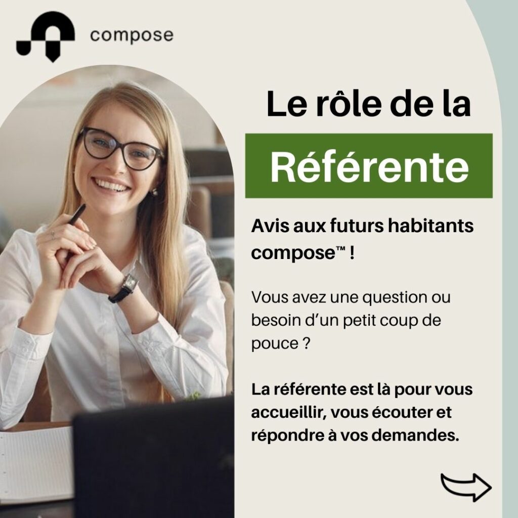 Avis aux futurs habitants Compose ! Vous avez une question ou besoin d’un petit coup de pouce ? La Référente est là pour vous accueillir, vous écouter et répondre à vos demandes.